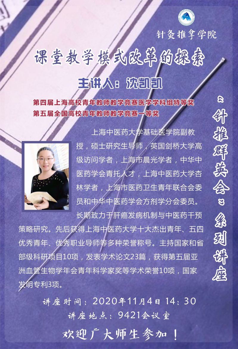 为了进一步推进课堂教学改革,提升教学质量,打造高效课堂,11月4日下午,av动漫 邀请第五届全国高校青年教师教学竞赛决赛医学组一等奖、第四届上海高校青年教师教学竞赛决赛医学组特等奖获得者沈凯凯副教授,以“创新开展课堂教学的‘教与学’模式改革的探索”为主题,与学院全体教师进行面对面的分享与交流。