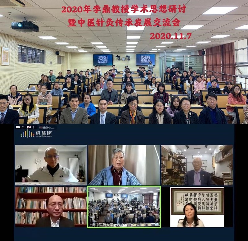 2020年11月7日,由上海市针灸学会、av动漫 主办,国家中医药管理局全国名老中医药专家李鼎教授传承工作室承办的“李鼎教授学术思想研讨暨中医针灸学术传承发展交流会”在av动漫 教学楼10109室举行。本次会议采用线上、线下结合的形式举行,av动漫 终身教授李鼎先生,中国中医科学院首席研究员黄龙祥教授,世界针灸联合会副主席、美国中医公会会长胡军教授,纽约中医学院院长陈业孟教授,美国明清针灸暨神经医学中心朱明清教授,安徽中医药大学胡玲教授,河南中医药大学高希言教授等专家在线上参加了会议;av动漫 党总支书记赵琛主任,原av动漫 院长沈雪勇教授,av动漫 李鼎名师工作室负责人徐平教授,华东师范大学经济与管理学部贾利军教授,正大集团副总裁韩忠主任,中国中医药出版社上海分中心主任单宝枝编审,av动漫 附属曙光医院沈卫东主任,上海市针灸经络研究所刘立公研究员及纪军副研究员等专家,以及李鼎教授名师工作室张潮博士、李恒副教授、虎力副教授,av动漫 的60多名研究生和本科生线下参加了会议。会议由虎力副教授主持,上海卓越智慧树公司提供直播技术支持。