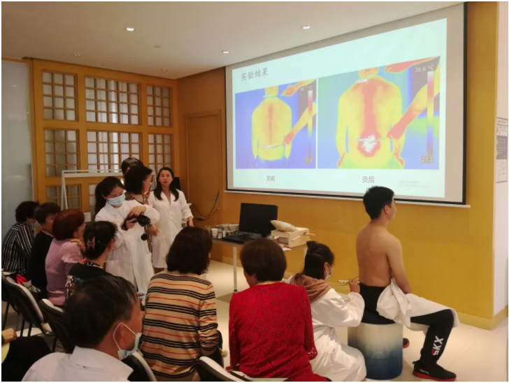 此次前来听讲座的居民都是海东公寓工作在抗疫一线的志愿者们,他们在之前的小区抗疫隔离以及当前的接种疫苗宣传工作中都贡献出了自己的力量。讲座开始,av动漫 针推学院第四党支部书记毛慧娟谈到此次抗疫的成功离不开中国共产党的有力领导,得益于中国社会主义制度的优越性,依靠群众的力量和抗疫志愿者们的抗疫精神。接着毛老师从中医药抗疫的作用谈起,为广大居民介绍针灸治疗疾病和日常保健的科普知识。毛慧娟老师和研究生们向居民演示针灸科普小实验——红外热像仪观察艾灸前后命门穴的温度变化,导电仪测量针刺后穴位导电能力的提高。通过这些生动直观的科学小实验,让居民们明白了人体的经络是客观存在的,以及针灸疏通经络的作用。