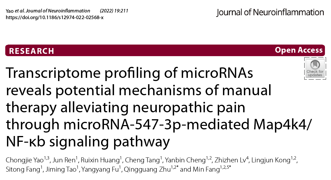 近期,Journal of Neuroinflammation(IF: 9.59)上发表了题为“Transcriptome profiling of microRNAs reveals potential mechanisms of manual therapy alleviating neuropathic pain through microRNA-547-3p mediated Map4k4/NF-κb signaling pathway”的文章。该研究首次运用miRNA高通量测序技术研究了推拿按揉对LDH模型大鼠抗炎镇痛效应的潜在机制,证实了推拿可以通过miRNA在表观遗传学水平上干预炎症相关基因的转录和翻译,以改善神经炎症并减轻神经病理性痛,阐释了推拿作为中医传统非药物疗法在未来疼痛相关疾病治疗中的独特优势。