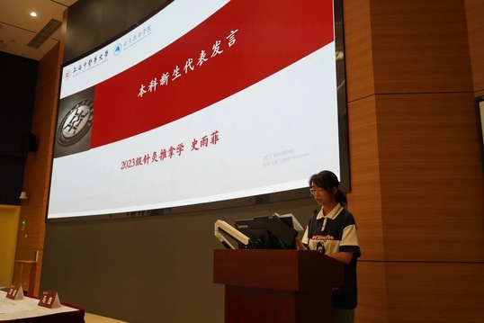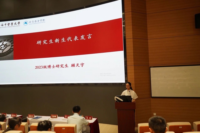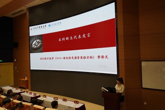 2023级中医学(5+3一体化针灸推拿英语方向)章译文、针灸推拿学史雨菲,作为学院医科专业的本科新生代表发言。两位同学都讲述了自己和家人与中医结缘的故事,使得她们决心报考av动漫 。她们纷纷表示,将倍感珍惜在上中医、在针推学院学习的机会,今后一定以传承中华优秀传统文化、学好专业知识与技能为己任,走好守正创新中医药这条康庄大道的每一步。